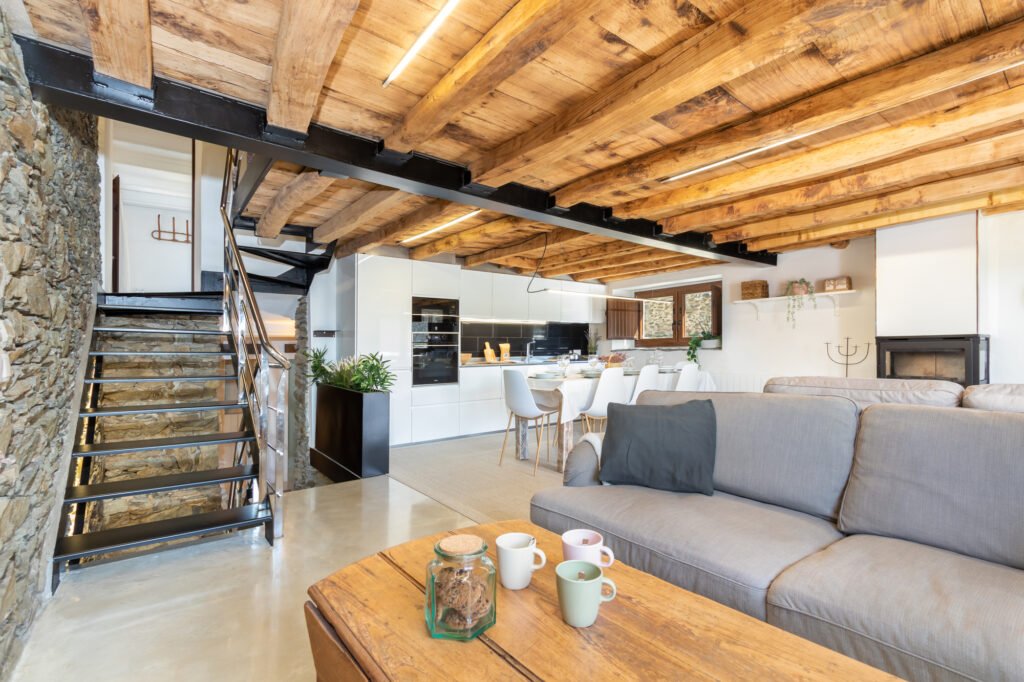 La nostra casa rural està dividida en 3 plantes, a l’entrada principal ens trobem amb un saló amb una magnífica xemeneia de llenya, Smart TV i una espectacular cuina menjador amb tot el necessari per gaudir de les teves fantàstiques vacances.
